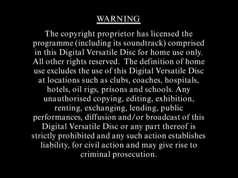 Availability: Seen at the beginning after the Columbia TriStar Home Video (later Columbia TriStar Home Entertainment and Sony Pictures Home Entertainment) logo on Columbia TriStar PAL tapes and Sony Pictures Home Entertainment PAL tapes including Men in Black, The Net, Call Me Claus, Macbeth, Spider-Man and Philadelphia. Sometimes It is seen at the beginning and at the end of some tapes for example of the 2000's reprints of 1984'sGhostbusters, 1998's Madeline, 2000's The Patriot, 1968's Oliver!, 1982's Annie, 1987's Hamburger Hill and 2004's Spider-Man 2. The December 1993-1997 variant was also seen on Nu Image releases and Eureka Video releases in Australia. The warning screen with black writing and a black background was also used by Universal Studios Home Entertainment, Abbey Home Entertainment and HiT Entertainment.